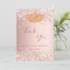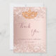 A rose gold background, decorated with rose gold confetti and a masquerade mask. Large hand lettered script and the text: Thank You. Personalize and add your thank you note and name. Your thank you note on the back.