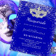 For an elegant Masquerade, Quinceañera, 15th birthday. A royal blue background. Decorated with faux silver glitter dust and a masquerade mask. Personalize and add a name, age and party details. The name is written with a hand lettered style script