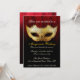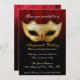 Masquerade Wedding Celebration Fancy Invitation. A fancy and elegant invitation featuring a gold toned masquerade mask with black flourishes on it, a cranberry toned background with a subtle damask pattern overlay into black and fancy type that is customizable for your party details.