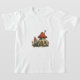 The whimsical t-shirt design features a vibrant garden scene bursting with color against a light-colored background. A cheerful gnome, sporting a [hat color] hat, tends to his flourishing flowers. Next to him sits a charming mushroom house, complete with a [detail from mushroom house, e.g., smoke curling from the chimney, polka dots adorning its surface, or a spiral staircase leading up its side]. The overall feel is lighthearted and joyful, perfect for anyone who loves gardens and a touch of whimsy