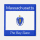 An authentic fine quality image of the flag of Massachusetts set between the state name and nickname over a flag-color background.