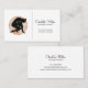 A simple elegant massage therapist business card featuring a crouching figure silhouette against a marble circle with flowing script type as a simple black and white business card. List your own massage type. Simple elegance
