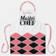 Geometric mosaic pavement style patterned print all over elegant apron in coral red, white, and black with a bold MASTER CHEF typography script.+++++++++++ You can personalize it with your name. ++++++++ It can be a nice gift for a cooking lover or a master chef - husband, friend, fiancee, or employee.
