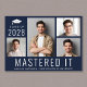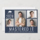 Modern masters degree dark blue graduation announcement card featuring a 4 picture photo collage, "Mastered It" written in large white letters and the grad's class year, name and school or university in simple white typography. On the reverse side, add an additional photo and a personalized message.
