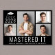 Modern masters degree black graduation announcement card featuring a 4 picture photo collage, "Mastered It" written in large capital white letters and the grad's class year, name and school or university in simple white typography. On the reverse side, add an additional photo and a personalized message.