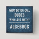 Need a funny math joke? Look no further. This button has a pun on algebra. "What do you call dudes who love math? Algebros."
