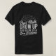 My 11 yo wore adult XL (5’7” 165#). The 8yo is small framed. She wore adult small and tied it in the back. Grandma wore adult large with long sleeve shirt underneath. Tall girl adult medium. Dark haired male adult large. Good quality dark Heather gray, Gildan brand shirt. -it was next up from basic choice and cost about $20 per shirt. Not too thick or thin. Washed and dried well, no major shrinkage. Not see-through. Can wear a bra under it fine. Screen print is just as shown and well done, front and back.