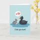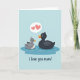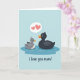 This greeting card shows two stylized aquatic birds floating close together, with the larger, rounded bird on the right in deep charcoal tones leaning in as if quietly protective. Beside it, a smaller light-grey bird with a little feather tuft tilts its head up toward the larger one, their simple bright eyes creating a tender, friendly connection ❤️. Both birds have orange beaks that stand out against their muted bodies, adding a cheerful contrast. They rest in a rich blue pool, where thin white ripples curve around them to suggest gentle movement. Above the smaller bird, a soft speech bubble holds two coral-red hearts, like a sweet, wordless message 🌼. Below the water scene, a short Mother’s Day message sits centered in a dark ink-like line, easy to spot against the pale background. The background stays a calm light blue, keeping the focus on the pair and their affectionate closeness. Two coral-red hearts float inside a rounded speech bubble just above the smaller bird’s head.