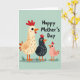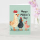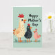 This card shows three stylized birds standing together on a muted green background, arranged from largest on the left to smallest on the right, like a close family leaning into one another ❤️. The left bird is cream with warm orange flecks and a steady, watchful posture that reads as gently protective. Next to it, a slightly smaller charcoal bird with tiny white speckles angles its gaze toward the others, creating a quiet sense of closeness and care. On the right, the smallest bird is rosy pink with soft white markings, tucked in as if reassured by the pair beside it 🌼. All three have bright red head crests with orange beaks and feet, adding lively points of color to the soft palette. In the upper right, the words “Happy Mother’s Day” appear in friendly black lettering, spaced clearly against the green. Fine textured strokes shape the feathers, and a few simple grassy marks sit beneath their feet near the bottom edge.