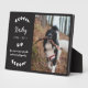 Matte black photo pet memorial plaque personalized with your pet's name, years living and photo with paw prints and greenery.