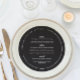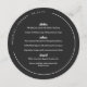 Round wedding menu in matte black with modern and trendy white fonts, and your names and wedding date in a curved text along the edge of the round wedding menu.