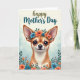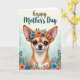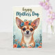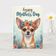 This card features a cute, small dog-like character in a stylized look, with its face centered near the top and turned forward as if meeting your eyes with gentle affection ❤️. Its large pointed ears frame deep brown, glossy eyes, and a tiny smile sits on its muzzle beside a few fine dark whiskers. A floral crown rests across its head, mixing coral and teal flowers with green leaves, like a sweet gift shared between close friends. Around the lower edges, matching coral-and-teal blooms and leafy sprigs rise upward to form a festive border that feels like it’s hugging the scene. The background fades from a pale creamy yellow at the top into a soft blue-green mist below, like a calm spring morning. Near the top, a short Mother’s Day message is placed above the character in flowing lettering, using muted olive with touches of deep teal 🌼. More coral blossoms and teal petals peek out from the bottom corners alongside layered green foliage.