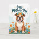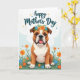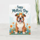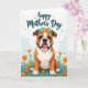 This card shows a stout little dog sitting front and center, with soft facial wrinkles, a broad muzzle, and a gentle, steady gaze that feels like a quiet gesture of friendship ❤️. A ring of blue and orange flowers with leafy green sprigs rests on its head, adding a sweet, caring touch like someone dressed it up just to make you smile. Its mouth is slightly open with a pink tongue showing, and the deep eyes look calm and affectionate rather than rowdy. The dog sits in a rich green field sprinkled with small blossoms in orange, sky blue, and sunny yellow, like tiny gifts scattered around it. Near the top, a short message is placed in flowing lettering, colored in a deep blue tone that stands out against the sky, with a few tiny star shapes nearby. The background is a light blue wash shaped like soft clouds, keeping the scene airy and springlike 🌼. Little sparkles in matching colors sit around the words near the upper edge of the design.