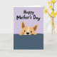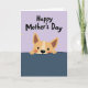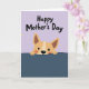 This card shows a cute, short-legged little dog peeking up from behind a wide dark blue band that stretches across the bottom, as if it’s shyly popping in to say hello ❤️. Its face is front and center with big curious dark eyes, a shiny black nose, and soft rosy cheeks that give it a tender, affectionate look. The fur is light cream with warm orange-brown patches, gently contrasting with a pale lavender background. Small, irregular yellow dots are scattered around like confetti, adding a friendly, celebratory feel 🌼. Near the top, the message “Happy Mother’s Day” is placed above the character in thick, rounded black lettering that’s easy to spot. The spacing leaves plenty of open air around the words, keeping the focus on the sweet interaction between text and character. The dog’s paws and head rise just over the edge of the dark blue area, making it look like it’s leaning in for attention. The lower section remains a solid dark blue field while the upper lavender area is sprinkled with those tiny yellow spots.
