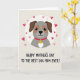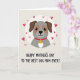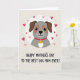 This greeting card features a stylized dog with a gentle, earnest expression, centered inside a white circular frame on a soft beige background. The dog’s coat is light gray with warm brown patches around the eyes and along the drooping ears, giving it a tender, affectionate look that feels like quiet devotion. A bright red collar stands out at the neck, holding a round golden tag marked with a single letter, catching light with a subtle shine. Small hearts float around the circle in shades of rosy pink and deep red, as if they’re drifting toward the dog like little signals of love ❤️. Soft shading along the face and ears adds depth, keeping the illustration smooth and calm rather than busy. Beneath the portrait, a short line of text sits centered in dark lettering, easy to spot against the pale background. The overall layout feels balanced and cozy, with the hearts and warm tones suggesting closeness and friendship 🌼. The final detail is the scattering of hearts around the white circle, ranging from tiny blush shapes to deeper crimson ones.