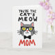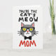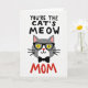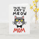 This card features a white background with a centered cartoon-style cat character that feels friendly and a little romantic in its gentle, knowing gaze ❤️. The cat has a gray head, black-rimmed glasses, bright yellow eyes, a small red nose, and a simple curved smile, with thin black whiskers spreading from each cheek. A neat black bow tie sits right under its chin, giving it a dressed-up look that suggests it showed up just for someone special. Across the top, the phrase “YOU’RE THE CAT’S MEOW” appears in rounded black letters, arranged in a slight arch above the character. The lettering looks casual and hand-drawn, keeping the mood warm and affectionate without being fussy. Beneath the cat, the word “MOM” is placed in strong red letters, centered as a clear focal point, with a small 🌼 accent nearby. The cat’s glasses are outlined in black, and the bow tie is a solid black shape with a small knot at the center.