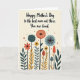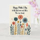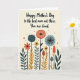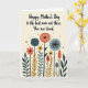 This greeting card features a soft creamy background with a garden of abstract flowers that feels like a quiet moment shared between close hearts ❤️. Near the top, a warm Mother’s Day message sits centered in a flowing, handwritten-style font, printed in a deep teal that stands out gently. Under the words, tall dark stems rise like steady supports, giving the scene a grounded, caring presence. The blooms mix sunburst shapes, speckled circles, and striped pods, as if each one is leaning in toward the next in friendly company. Colors shift between deep teal, earthy orange, mustard yellow, and calm sky blue, creating a cozy balance with a touch of cheer 🌼. Fine internal patterns inside the petals add texture, like little details you notice when you look closely at someone you love. Tiny reddish-orange dots scatter across the lower area like confetti sprinkled over the flowers. The bottom half is filled with layered botanical shapes, with the darkest stems running vertically and the brightest petals clustered around them.