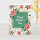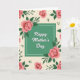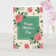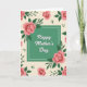 This greeting card features a centered emerald-green rectangle framed by a thin white outline, giving the layout a calm, steady focal point. Inside that panel, the words “Happy Mother’s Day” sit prominently in flowing white lettering, reading clearly against the deep green. Around it, a creamy beige background spreads out like a soft backdrop, dotted with stylized flowers that feel gently affectionate, like a bouquet arranged with care ❤️. The blossoms range from pale blush to deeper rosy centers, and their rounded petals create a tender, friendly mood without needing extra decoration. Dark green leaves and curling stems weave between the blooms, adding a quiet sense of closeness, as if the pieces are leaning toward one another 🌼. The text stays contained within the central panel while the floral elements remain outside it, creating a balanced contrast between structure and free-form nature. Small clusters of leaves and scattered pink flowers sit across the beige field, with a few stems curving diagonally near the corners.