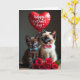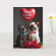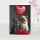 This card shows two young cats dressed up for an occasion, sitting close together as if they’re sharing a quiet, friendly moment ❤️. In the center, a cocoa-brown kitten wears a small sky-blue bow tie, nestled beside a cream-colored kitten with darker face and paw markings and a pink bow. Their bright blue eyes look straight ahead, and the slight tilt of their heads makes them seem gently curious about each other. Above them floats a red, heart-shaped balloon with a short message written in white lettering near the top. Along the bottom edge, a full cluster of deep red roses spreads across the foreground, adding a romantic touch that frames the pair 🌼. The cats rest on a warm, wood-textured surface, while the background stays softly shaded so the colors stand out. Fine whiskers catch the light, and the balloon string trails downward toward the space above the roses.