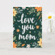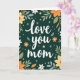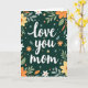 This design shows a deep teal background like a shaded garden at dusk, with a tender, romantic warmth carried through the soft floral framing ❤️. In the center, the words “love you mom” appear in flowing white lettering, standing out clearly against the dark field. The text sits neatly in the middle of the card, leaving comfortable space around it so the message feels calm and focused. Around the edges, stylized flowers and leaves form a loose border, as if they’re gently leaning inward to cradle the words. Yellow and orange blossoms mingle with white daisy-like flowers, each with small contrasting centers that add a sweet, friendly charm 🌼. Muted green and cool gray leaves weave between the petals, creating layered texture without crowding the center. Tiny dots and small star shapes in coral, light gray, and soft teal are scattered across the background like a quiet sparkle. The floral border is thickest at the corners, with petals, leaves, and a few star-like accents tapering toward the sides.