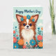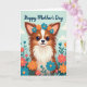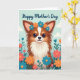 This greeting card shows a fluffy, small dog-like creature centered on the front, wearing a wreath of stylized blue and orange flowers that nestles between its upright ears. Its big, glossy eyes and slight smile create a tender, friendly look, like it’s quietly offering affection ❤️. The fur is reddish-brown with soft white on the chest and a white marking on the forehead, giving the face extra warmth and contrast. Behind it, a light blue sky with a few rounded, pale clouds keeps the scene airy and gentle. Along the bottom and sides, a garden of simplified blooms in coral, orange, and teal sits among leafy greens, surrounding the character like a cheerful hug 🌼. Near the top, a short greeting appears in flowing, hand-drawn lettering, set in a dark tone that stands out clearly against the sky. The flower wreath shows small clustered petals in blue and orange, with tiny green accents tucked between the blossoms.