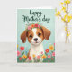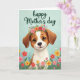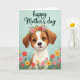 This card features a sweet, youthful puppy centered on the front, gazing forward with big, shining eyes and a gentle little smile that feels like a quiet cuddle ❤️. A ring of blossoms rests on its head like a crown, mixing pink, orange, and red petals that suggest someone lovingly arranged them just for this moment. Beneath the pup, a spring meadow spreads out with small flowers in yellow, red, and pink, their green stems weaving together like friends standing close. The tender look on the puppy’s face pairs with the cheerful blooms to create a soft, romantic scene without needing anything flashy. Behind everything, the background is a pale aqua wash with a light texture that keeps the mood calm and airy. Near the top, a short greeting appears in dark emerald cursive-style lettering, floating with plenty of open space around it 🌼. The flower crown shows clustered pink buds at the front, with orange petals fanning outward against the cool aqua backdrop.