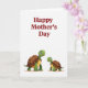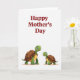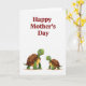 This greeting card features a simple digital illustration centered on a caring parent-and-child bond ❤️. Near the top, the words “Happy Mother’s Day” sit in a deep burgundy serif font, spaced neatly and easy to read. Below the text, two friendly, human-like shelled reptiles stand close together, with the larger one leaning in as if watching over the smaller one. The smaller character tilts its head up with bright blue eyes, and their shared gaze feels tender, like a quiet moment of closeness between loved ones. Their shells are rich brown, their skin is green, and their undersides are sunny yellow, giving the pair a cheerful look without crowding the page 🌼. The background stays white and open, keeping attention on the characters and the heading. A soft pink oval shadow rests beneath their feet, lightly grounding them on the page.