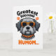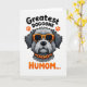 This card features a shaggy-haired dog centered on a bright white background, giving the whole design a fresh, high-contrast look. The dog’s coat is illustrated in layered charcoal and ash grays, with soft shading that adds depth around the muzzle and ears. Oversized black sunglasses sit across its face, and the frames glow in a strong orange that makes the dog look like it’s sharing a confident, affectionate wink ❤️. Around its neck, a chunky linked chain collar repeats that same orange, like a stylish gift from someone who adores their loyal companion. Near the top, rounded black lettering reads “Greatest DOGGONE,” with two small orange paw prints placed to either side like little flourishes. Near the bottom, “HUMOM...” appears in matching orange, set apart so it reads like a warm, teasing nickname 🌼. The orange details—the paw prints, glasses frames, and chain—stand out sharply against the white space while the gray fur remains the main texture. The dog’s sunglasses are glossy black, with the orange frames and collar forming the brightest accents on the page.
