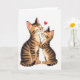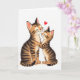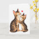 Designed with two striped cats as the focus, this digital illustration shows a larger tabby on the left resting with eyes closed while a smaller tabby on the right leans in close, their cheeks touching in a quiet, affectionate nuzzle ❤️. The smaller cat’s front paw wraps gently around the larger one, adding a sweet, protective touch that reads like close friendship or romance. The background is a wide, plain white space, keeping all attention on their soft expressions and closeness. Warm ochre and deep sepia stripes create a classic tabby look, with subtle shading that gives the fur a lightly textured feel. Soft pink appears on their noses and inside their ears, adding a tender warmth to the scene 🌼. Near the top, simple text sits above the pair in a red tone, centered and easy to spot against the white. A single red heart floats above their heads, positioned near the upper center of the card.