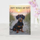 This greeting card shows a short-bodied dog standing alert on a sandy path, its sleek coat split between deep black and warm burnt-orange tones that glow in the low sunset light ❤️. Sparse beach grasses line both sides like gentle guides, drawing your eye toward the dog as if you’ve just walked up to share a quiet moment together. The dog’s dark, thoughtful eyes face forward with a soft, trusting look that suggests companionship and closeness without needing a single gesture. In the background, calm water meets a wide sky shifting from rich amber near the sun into peach and faint violet closer to the horizon. Across the upper portion of the sky, a crisp hand-drawn message sits prominently, with dark lettering that stands out against the lighter sunset colors. The text is centered high above the scene, leaving the dog and shoreline unobstructed as the main focus. Subtle sand ripples and tiny footprints-like textures appear beneath the dog’s paws, adding a grounded, lived-in feel 🌼. The sun sits low near the horizon, casting a thin golden path of light across the water.
