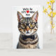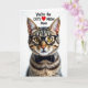 This card features a sleek tabby cat shown straight on against a bright white background, giving it the spotlight like a close-up portrait. The cat’s amber eyes look directly at you through dark-rimmed glasses, creating a smart, affectionate gaze that feels like a friendly inside joke. A dark bow tie sits neatly under its chin, adding a dressed-up touch that reads like it’s ready for a sweet family photo ❤️. Soft, diffused lighting brings out the brown-and-black striping in the fur, and the fine whiskers stand out with sharp detail. Above the cat’s head, the message “You’re the CAT’S ❤️ MEOW Mom” is placed in a casual, flowing style, with most of the letters in dark ink and the heart in bright red. The layout keeps the words floating clearly at the top while the cat stays centered below, balancing humor with a tender, appreciative tone. The background remains plain white with no extra objects, making the glasses, bow tie, and red heart the main pops of contrast 🌼.