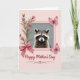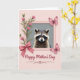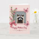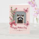 Designed with a tender, affectionate mood, this card centers on a small woodland animal with a dark face mask and softly banded fur, looking outward with large, gentle eyes ❤️. The creature sits inside a pale pink frame that stands out against a quiet gray inner background, while a muted pink field surrounds the whole design. In the upper left, a slim green stem rises with several pink, bell-shaped blossoms that lean toward the animal as if offering a friendly hello. At the lower left corner of the frame, a satin-like pink bow is tied in full loops, adding a sweet, gift-like touch. On the right side, two detailed pink butterflies hover close together, their wings angled as if sharing a private moment 🌼. The words “Happy Mother’s Day” appear centered beneath the framed illustration in dark gray lettering, with a matching decorative underline curling beneath the text. Soft lighting highlights the fine whiskers, the layered fur texture, and the faint patterns on the butterflies’ wings.