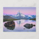 Photo postcard of the reflection of the mighty Matterhorn mountain in the still water of Stellisee lake high in the Alps above Zermatt, Switzerland at sunrise.
