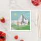 A vector style illustration of the Matterhorn in Switzerland. This is the look of a retro travel poster. Hikers walking towards the mountains, a cable car can be seen in the distance.