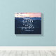 Inspirational quote scripture canvas print depicts a nature photograph with a beautiful pink and blue mountain sunset. It features Bible Verse Matthew 19:26, "With God all things are possible." *
