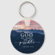 Inspirational quote scripture keychain depicts a nature photograph with a beautiful pink and blue mountain sunset. It features Bible Verse Matthew 19:26, "With God all things are possible." _