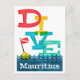 Colorful Mauritius scuba design. Retro typography in inkpress style with the word "Dive", along with a scuba flag floating in the ocean.