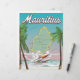 Illustrated map of Mauritius in a beautiful vintage or retro style, featuring a sea plane landing on a beautiful beach.