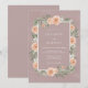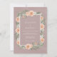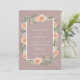 This elegant design features a soft mauve backdrop adorned with a lush arrangement of peach roses and ranunculus. Sage green eucalyptus leaves and delicate white accent flowers create a romantic botanical atmosphere. The color palette of dusty rose and warm peach offers a sophisticated aesthetic for a seasonal event.