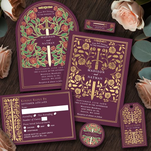 Mauve Royal Medieval Silver Sword Wedding Foil Invitation