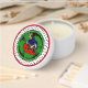 These paper plates feature HoMeArt's original variation of a pre-WWI Maxfield Parrish elf w/ white & black polka dot tights against kelly green round medallion floating above a black on white polka dot background. The greeting 'Merry Christmas' is repeated encircling the medallion.