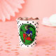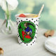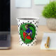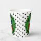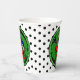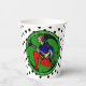 These paper cups feature HoMeArt's original variation of a pre-WWI Maxfield Parrish elf w/ white & black polka dot tights against kelly green round medallion floating above a black on white polka dot background. The greeting 'Merry Christmas' is repeated encircling the medallion.