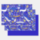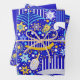 Colorful dreidels, menorahs, and stars on a rich blue background. One sheet each of large and small print, and one sheet of solid blue.