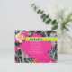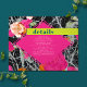 Pink diamond shape over pink orange and peach modern floral with dark marbleized design. "details" text in blue over neon yellow bar. Remaining text is white.