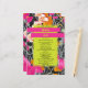 Neon yellow rectangle shape over pink orange and peach modern floral with dark marbleized design. Names are neon yellow on hot pink bars.