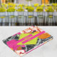 Neon yellow diamond shape over pink orange and peach modern floral with dark marbleized design. Names in neon yellow over hot pink bars. Remaining text is black.