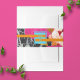 Blue square shape over pink orange and peach modern floral with dark marbleized design. Names in blue over orange bars. Remaining text is black.