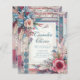 Maximalist wedding themed item with text template fields and graphics featuring an eclectic mix of decoupage, fabrics, ribbons in pastel shades of blue, pink, teal. Scrapbook decoupage style item with a shabby, country, vintage floral vibe.