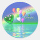 A May birthstone birthday sticker with my design of an emerald heart, balloons and a rainbow.