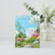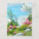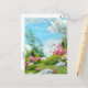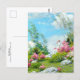 A fine art postcard featuring the landscape, May Morning (1908) by Charles Courtney Curran (1861-1942). He was an American Impressionist painter, renowned for his depictions of figures and landscapes, particularly of beautiful women in tranquil settings The painting showcases pink rhododendrons on a spring day with a woman in a white dress enjoying the scenery.